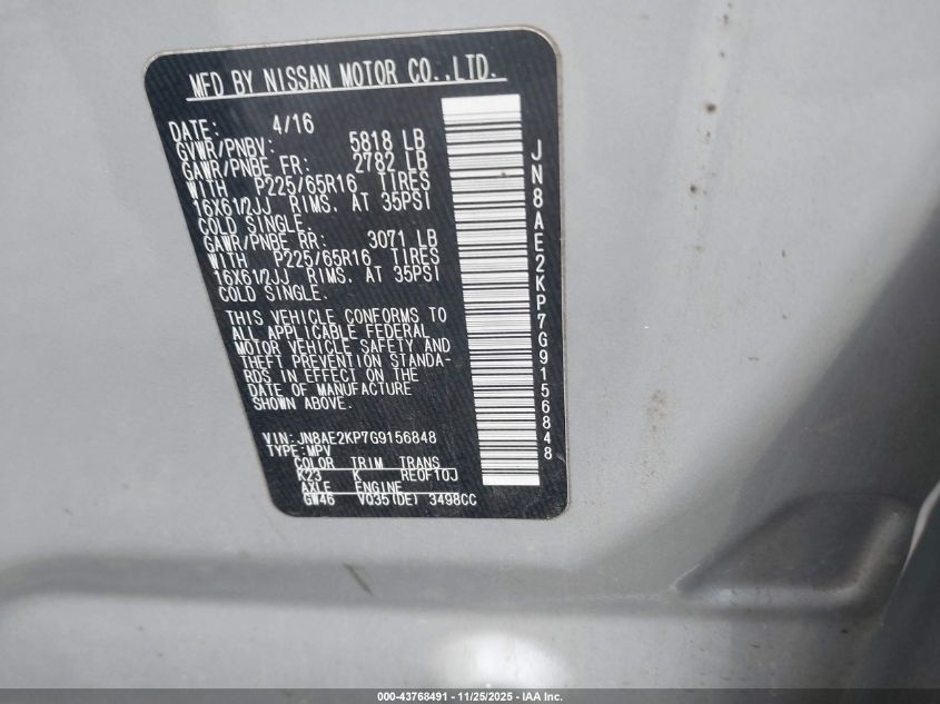 2016 NISSAN QUEST 2016 року Бензин, 3.5, Передний привод, vin - JN8AE2KP7G9156848 из США