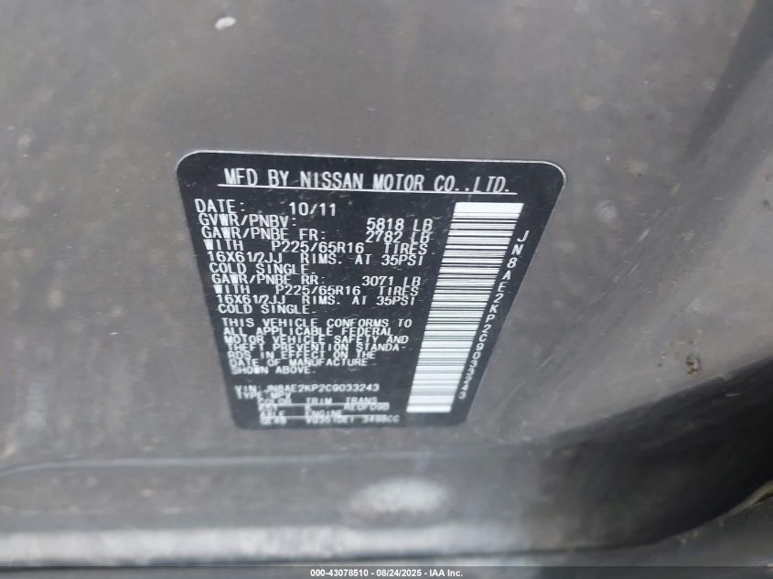 Цвет СерыйЦилиндры 6Привод Передний приводVIN JN8AE2KP2C9033243Состояние СтационарноПовреждения Передняя или задняя AutoRIA
