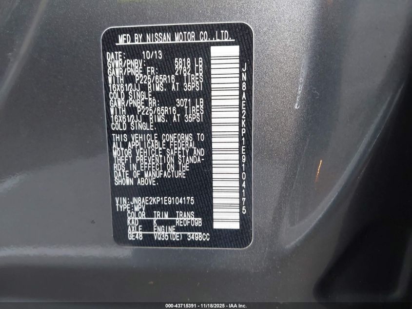 Цвет СерыйЦилиндры 6Привод Передний приводVIN JN8AE2KP1E9104175Состояние Заводится и едет (проверено)Повреждения Правая сторона AutoRIA