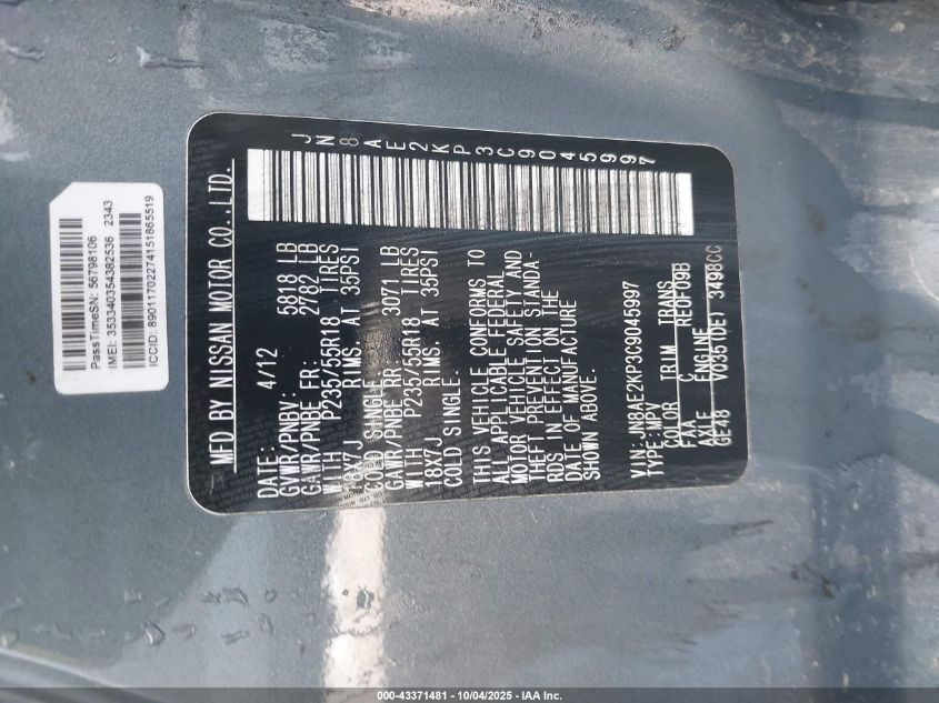 Цвет СинийЦилиндры 6Привод Передний приводVIN JN8AE2KP3C9045997Состояние ЗаводитсяПовреждения Передняя правая AutoRIA