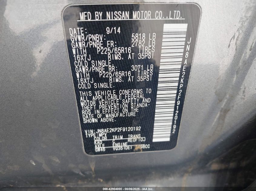 2015 NISSAN QUEST 2015 року Бензин, 3.5, Передний привод, vin - JN8AE2KP2F9120192 из США