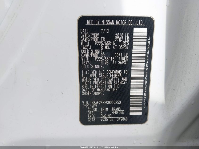 2012 NISSAN QUEST 2012 року Бензин, 3.5, Передний привод, vin - JN8AE2KP2C9050253 из США