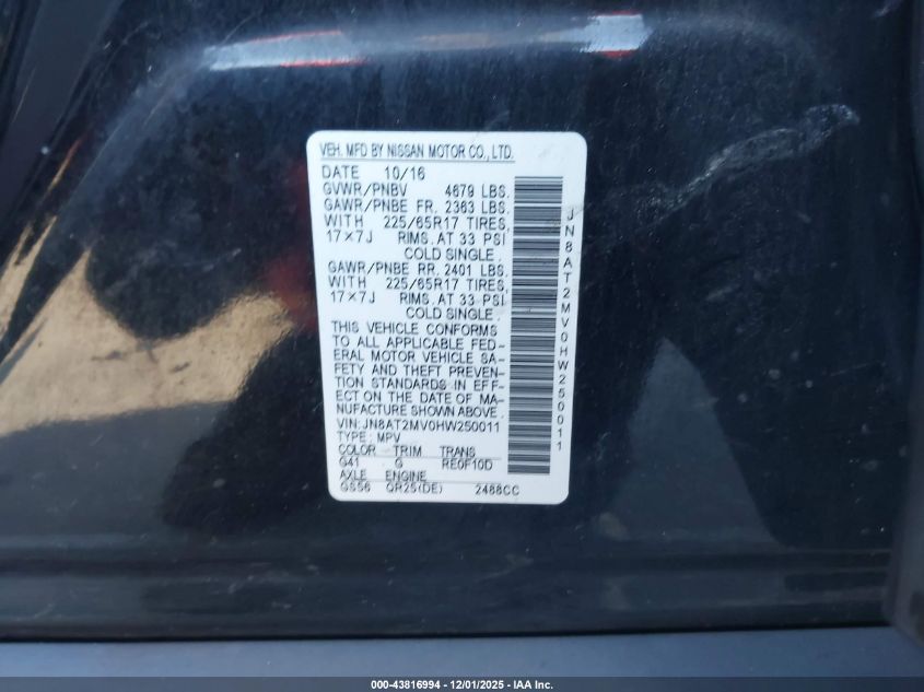 2017 NISSAN ROGUE 2017 року Бензин, 2.5, Полный привод, vin - JN8AT2MV0HW250011 из США