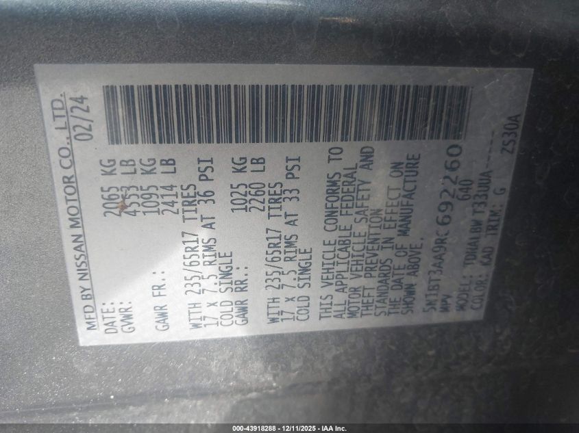 Цвет СерыйЦилиндры 3Привод Передний приводVIN 5N1BT3AA9RC692260Состояние СтационарноПовреждения Передняя или задняяДата аукциона 2025-12-17
