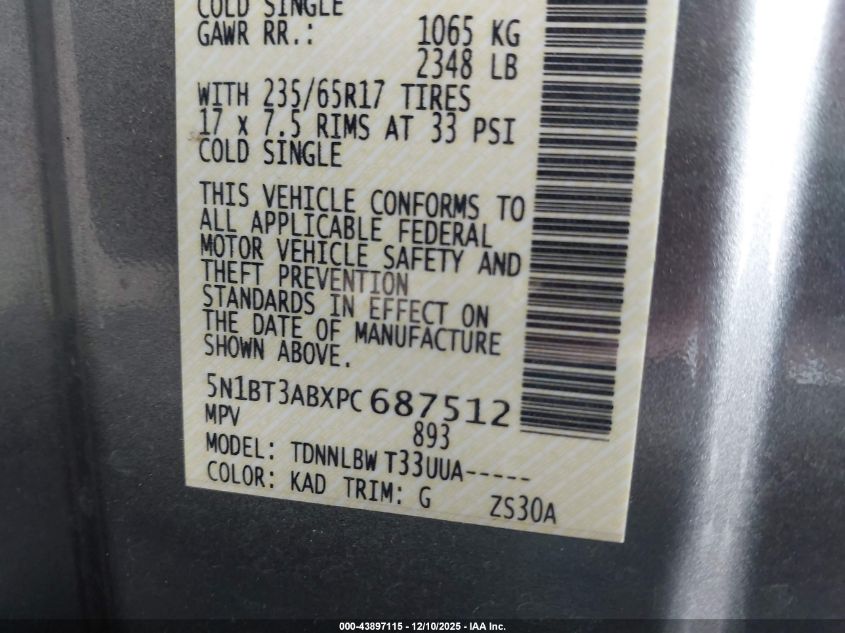 Цвет СерыйЦилиндры 3Привод Полный приводVIN 5N1BT3ABXPC687512Состояние Заводится и едет (проверено)Повреждения Передняя или задняя AutoRIA