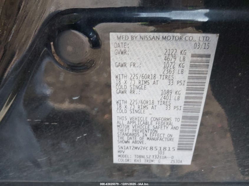 2015 NISSAN ROGUE 2015 року Бензин, 2.5, Полный привод, vin - 5N1AT2MV2FC851815 из США