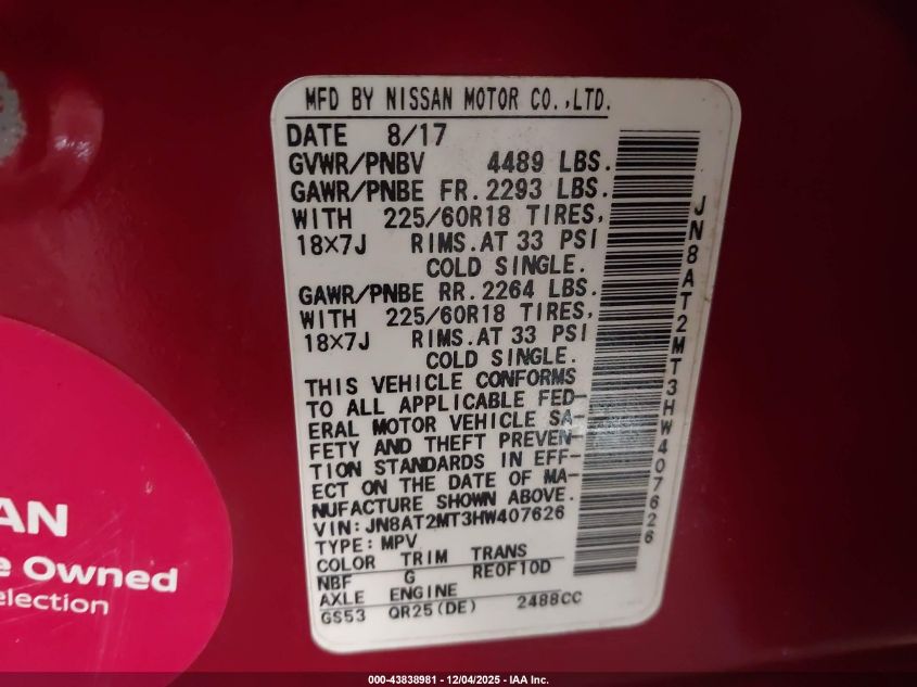 2017 NISSAN ROGUE 2017 року Бензин, 2.5, Передний привод, vin - JN8AT2MT3HW407626 из США