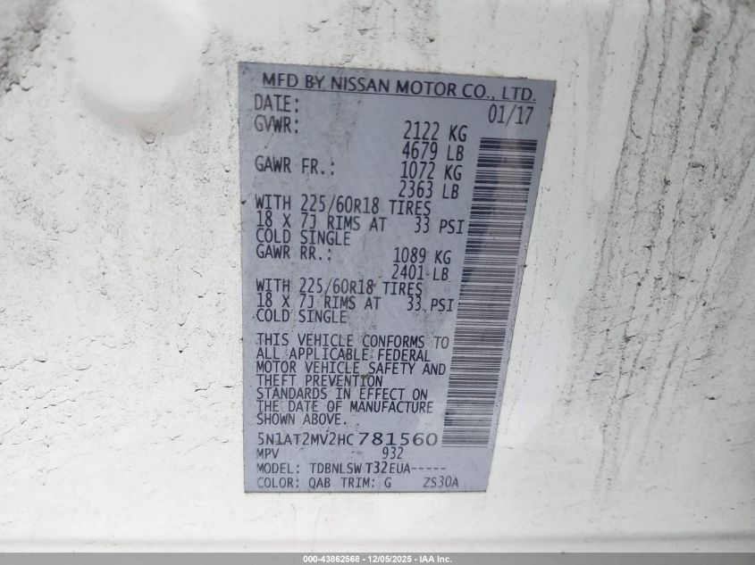 2017 NISSAN ROGUE 2017 року Бензин, 2.5, Полный привод, vin - 5N1AT2MV2HC781560 из США