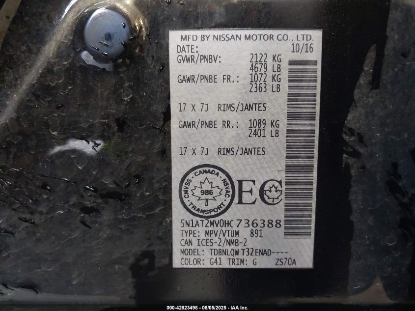 2017 NISSAN ROGUE 2017 року Бензин, 2.5, Полный привод, vin - 5N1AT2MV0HC736388 из США