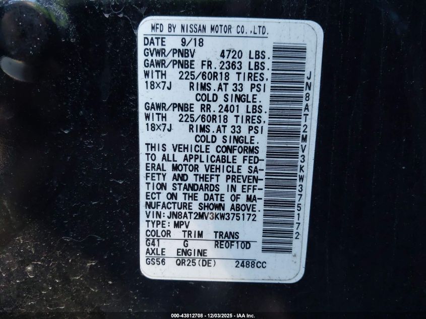 2019 NISSAN ROGUE 2019 року Бензин, 2.5, Полный привод, vin - JN8AT2MV3KW375172 из США