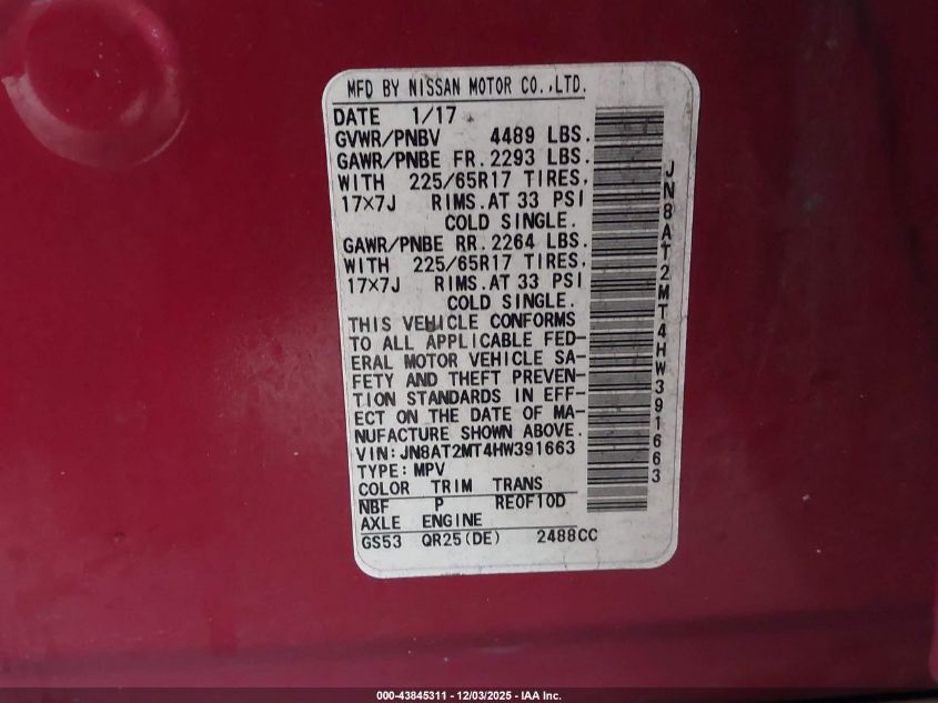 2017 NISSAN ROGUE 2017 року Бензин, 2.5, Передний привод, vin - JN8AT2MT4HW391663 из США