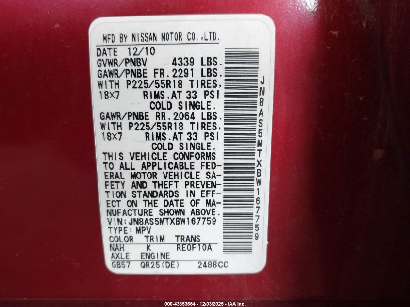 2011 NISSAN ROGUE 2011 року Бензин, 2.5, Передний привод, vin - JN8AS5MTXBW167759 из США