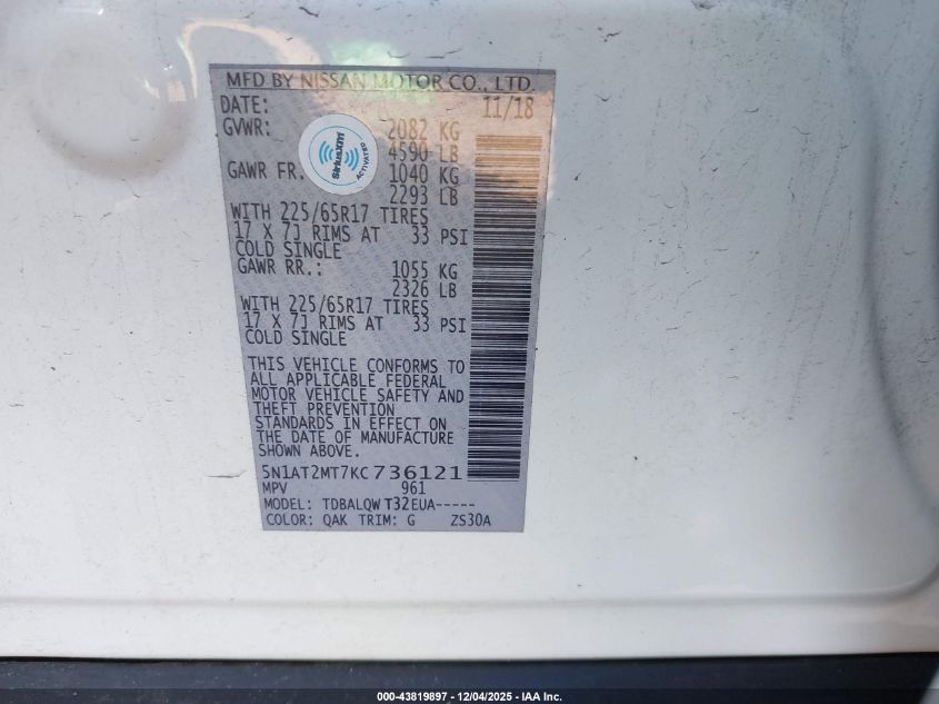 2019 NISSAN ROGUE 2019 року Бензин, 2.5, Передний привод, vin - 5N1AT2MT7KC736121 из США