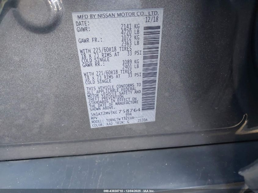 2019 NISSAN ROGUE 2019 року Бензин, 2.5, Полный привод, vin - 5N1AT2MV3KC758764 из США