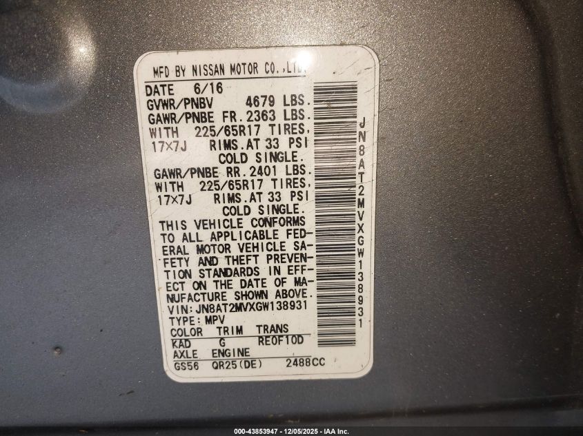 2016 NISSAN ROGUE 2016 року Бензин, 2.5, Полный привод, vin - JN8AT2MVXGW138931 из США
