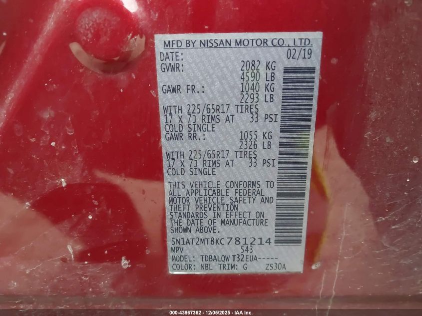 2019 NISSAN ROGUE 2019 року Бензин, 2.5, Передний привод, vin - 5N1AT2MT8KC781214 из США