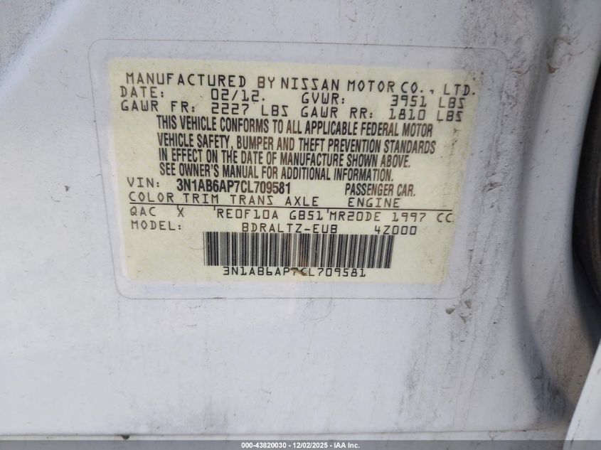 2012 NISSAN SENTRA 2012 року Бензин, 2.0, Передний привод, vin - 3N1AB6AP7CL709581 из США
