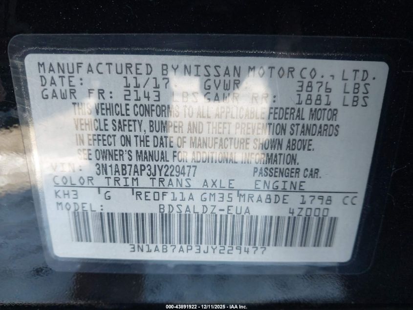 2018 NISSAN SENTRA 2018 року Бензин, 1.8, Передний привод, vin - 3N1AB7AP3JY229477 из США