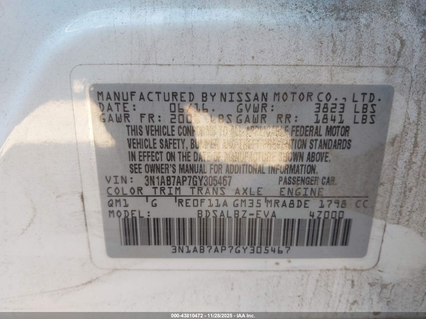 2016 NISSAN SENTRA 2016 року Бензин, 1.8, Передний привод, vin - 3N1AB7AP7GY305467 из США