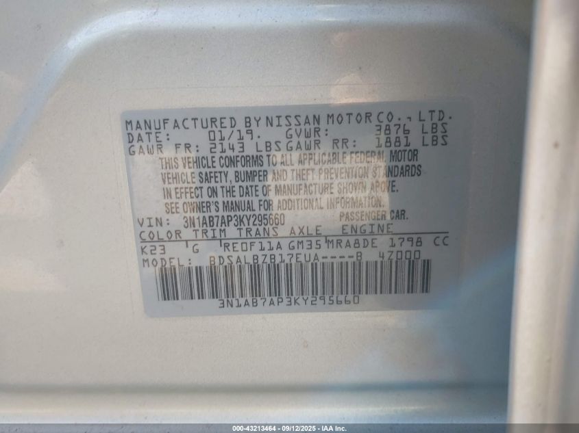 2019 NISSAN SENTRA 2019 року Бензин, 1.8, Передний привод, vin - 3N1AB7AP3KY295660 из США