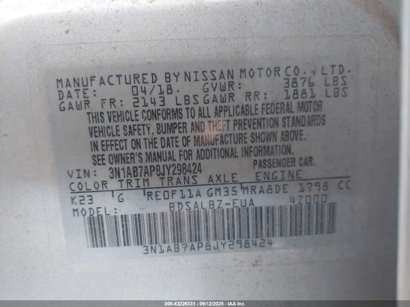 Цвет СеребряныйЦилиндры 4Привод Передний приводVIN 3N1AB7AP8JY298424Состояние Заводится и едет (проверено)Повреждения Передняя или задняяДата аукциона 2025-12-16 AutoRIA