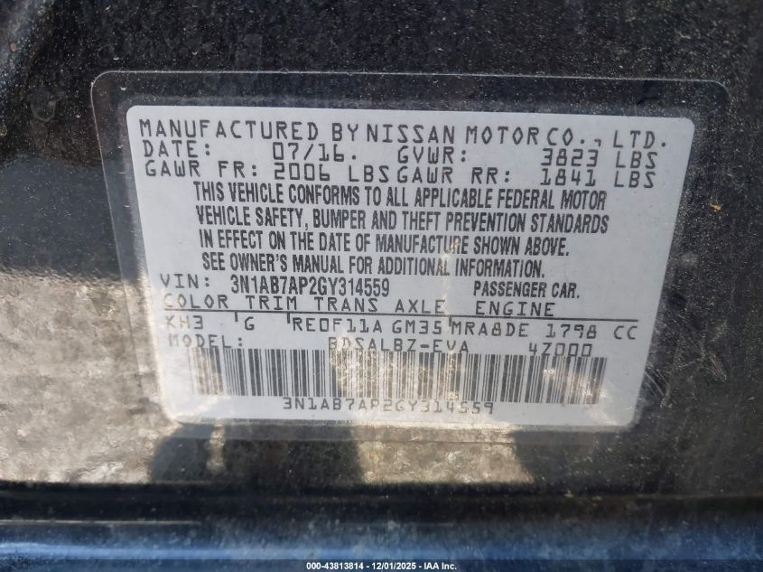2016 NISSAN SENTRA 2016 року Бензин, 1.8, Передний привод, vin - 3N1AB7AP2GY314559 из США