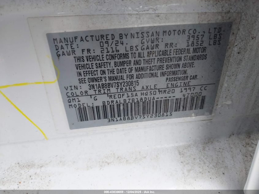 2025 NISSAN SENTRA 2025 року Бензин, 2.0, Передний привод, vin - 3N1AB8BV7SY230815 из США