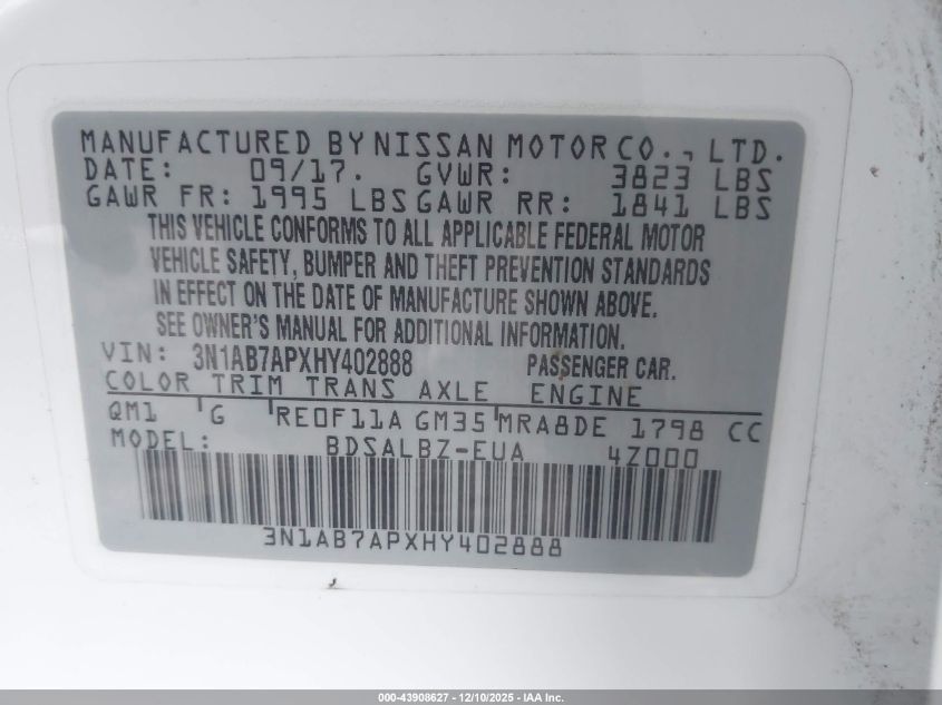 2017 NISSAN SENTRA 2017 року Бензин, 1.8, Передний привод, vin - 3N1AB7APXHY402888 из США