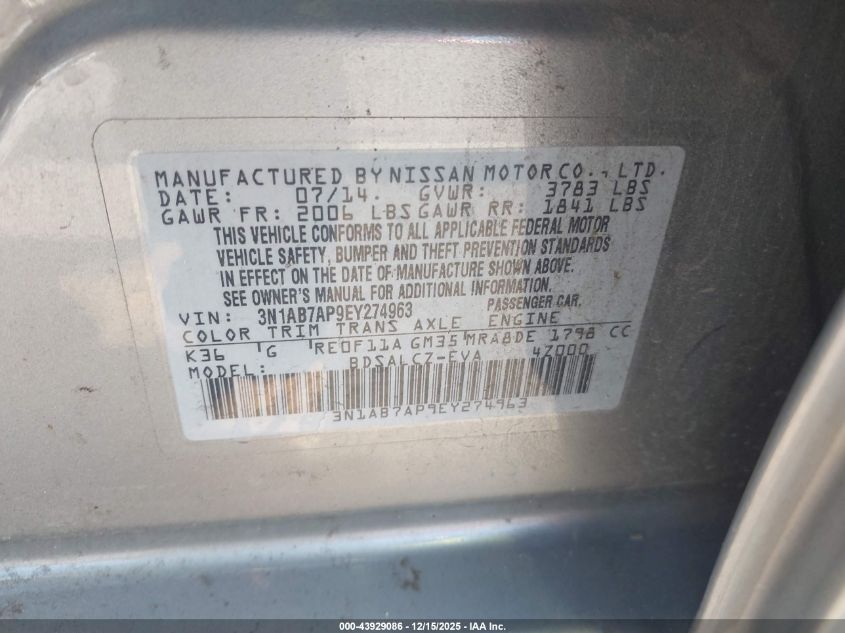 2014 NISSAN SENTRA 2014 року Бензин, 1.8, Передний привод, vin - 3N1AB7AP9EY274963 из США
