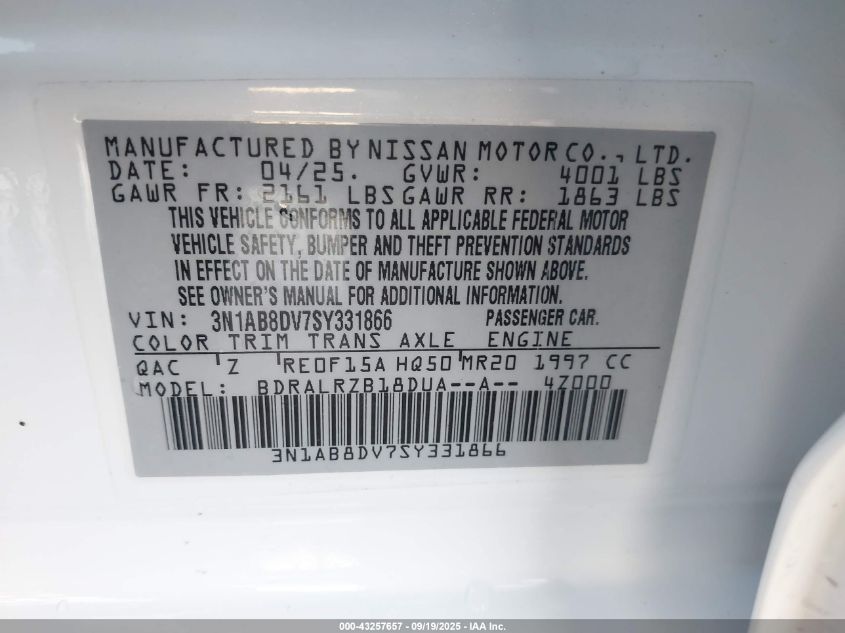 2025 NISSAN SENTRA 2025 року Бензин, 2.0, Передний привод, vin - 3N1AB8DV7SY331866 из США