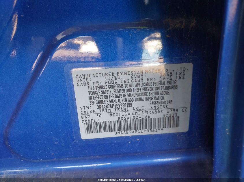 Цвет СинийЦилиндры 4Привод Передний приводVIN 3N1AB7AP1EY338199Состояние СтационарноПовреждения Передняя или задняяДата аукциона 2025-12-09 AutoRIA