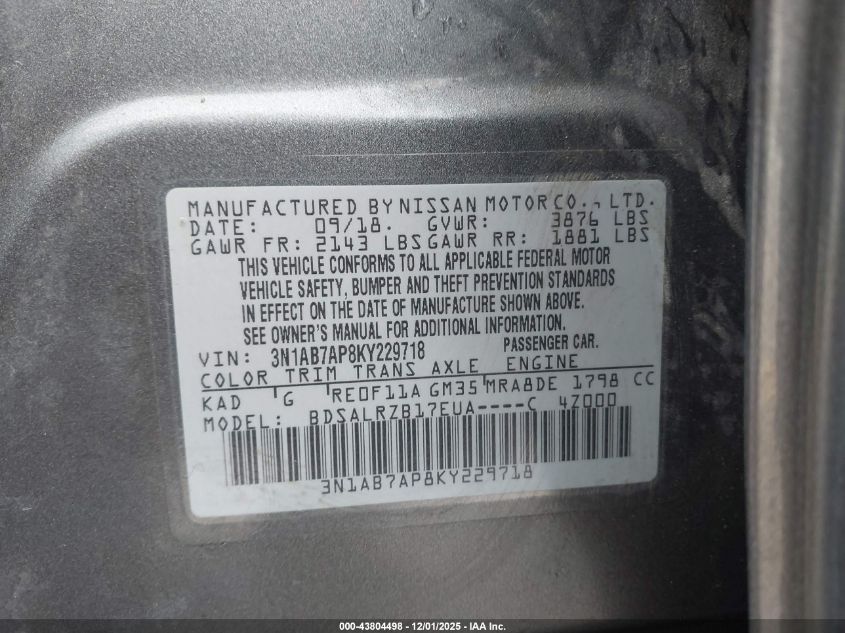 2019 NISSAN SENTRA 2019 року Бензин, 1.8, Передний привод, vin - 3N1AB7AP8KY229718 из США