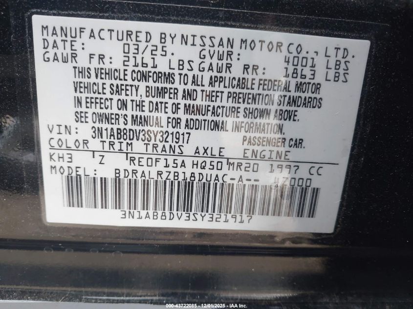 2025 NISSAN SENTRA 2025 року Бензин, 2.0, Передний привод, vin - 3N1AB8DV3SY321917 из США