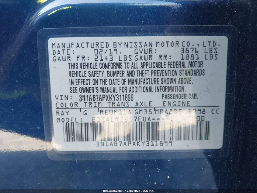 2019 NISSAN SENTRA 2019 року Бензин, 1.8, Передний привод, vin - 3N1AB7APXKY311899 из США