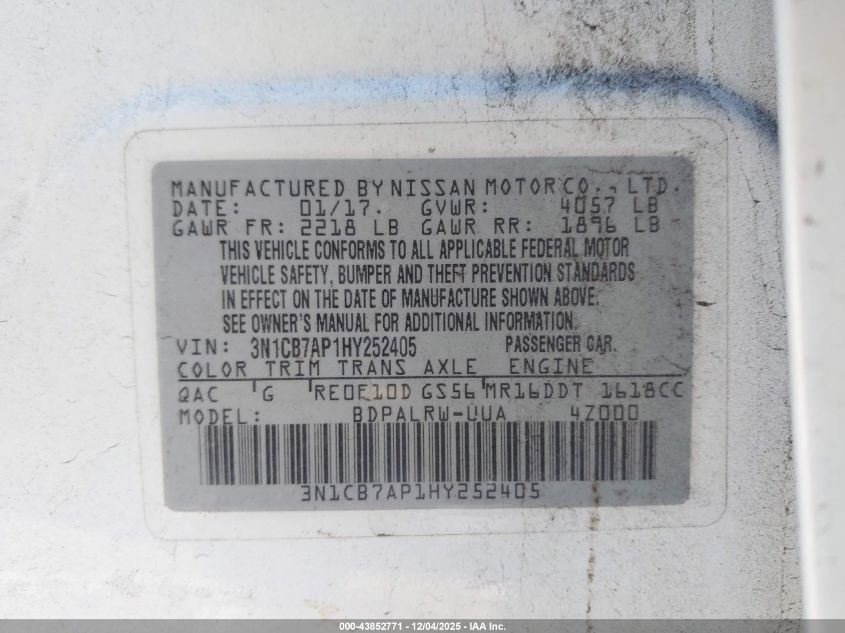 2017 NISSAN SENTRA 2017 року Бензин, 1.6, Передний привод, vin - 3N1CB7AP1HY252405 из США