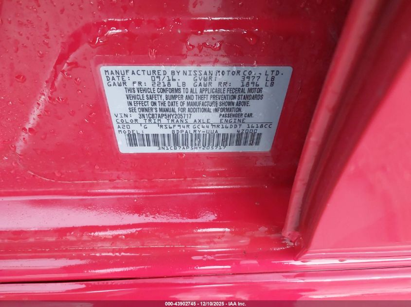 2017 NISSAN SENTRA 2017 року Бензин, 1.6, Передний привод, vin - 3N1CB7AP5HY205717 из США
