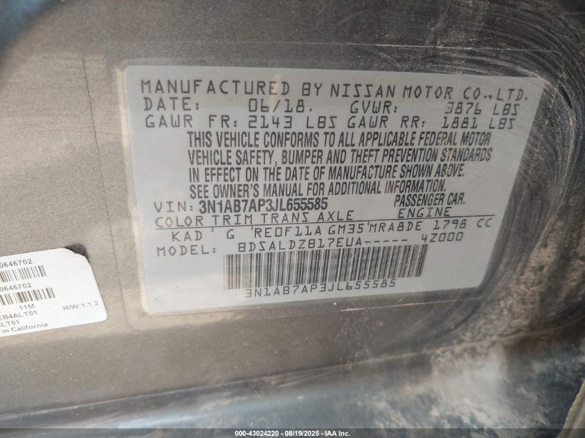 2018 NISSAN SENTRA 2018 року Бензин, 1.8, Передний привод, vin - 3N1AB7AP3JL655585 из США