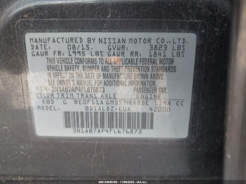 2015 NISSAN SENTRA 2015 року Бензин, 1.8, Передний привод, vin - 3N1AB7AP4FL676873 из США