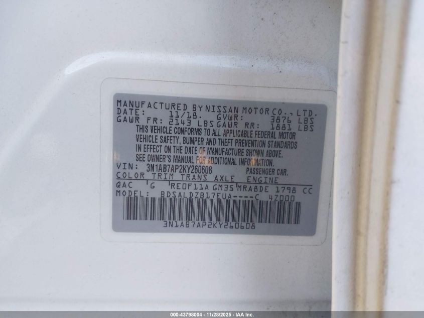 2019 NISSAN SENTRA 2019 року Бензин, 1.8, Передний привод, vin - 3N1AB7AP2KY260608 из США