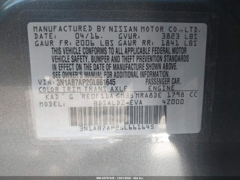 2016 NISSAN SENTRA 2016 року Бензин, 1.8, Передний привод, vin - 3N1AB7AP2GL661645 из США