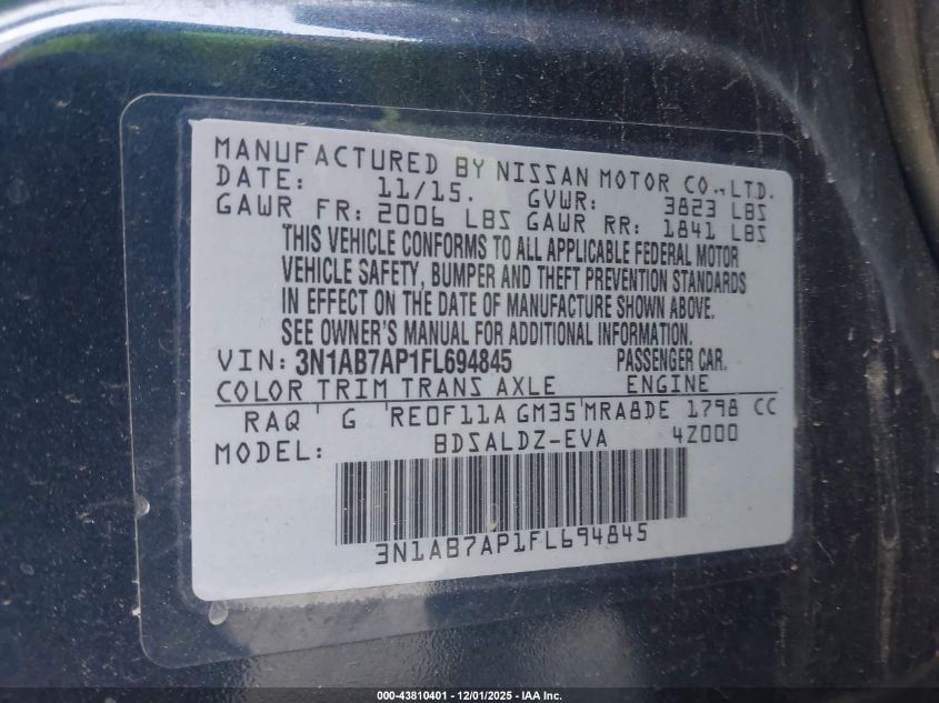 Цвет СинийЦилиндры 4Привод Передний приводVIN 3N1AB7AP1FL694845Состояние Заводится и едет (проверено)Повреждения Задняя правая AutoRIA