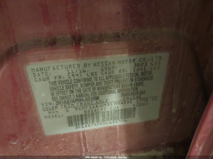 2017 NISSAN SENTRA 2017 року Бензин, 1.8, Передний привод, vin - 3N1AB7AP0HL651956 из США