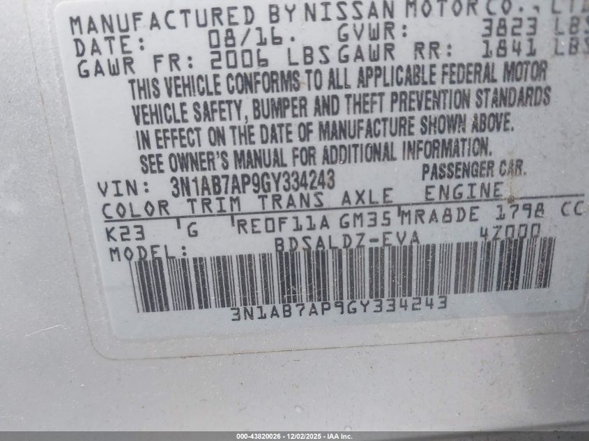 2016 NISSAN SENTRA 2016 року Бензин, 1.8, Передний привод, vin - 3N1AB7AP9GY334243 из США