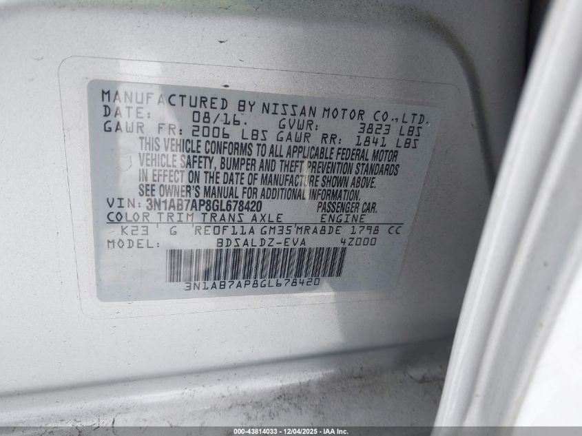 2016 NISSAN SENTRA 2016 року Бензин, 1.8, Передний привод, vin - 3N1AB7AP8GL678420 из США
