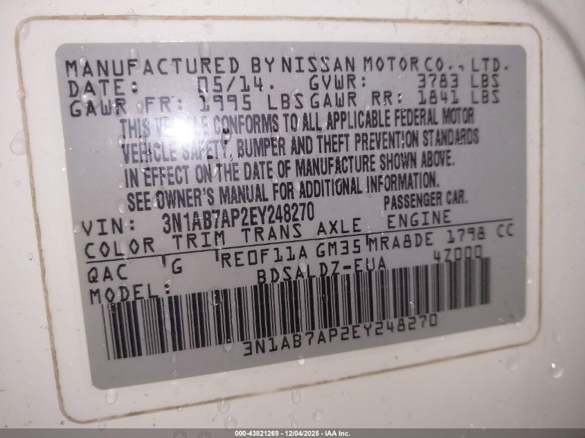 2014 NISSAN SENTRA 2014 року Бензин, 1.8, Передний привод, vin - 3N1AB7AP2EY248270 из США