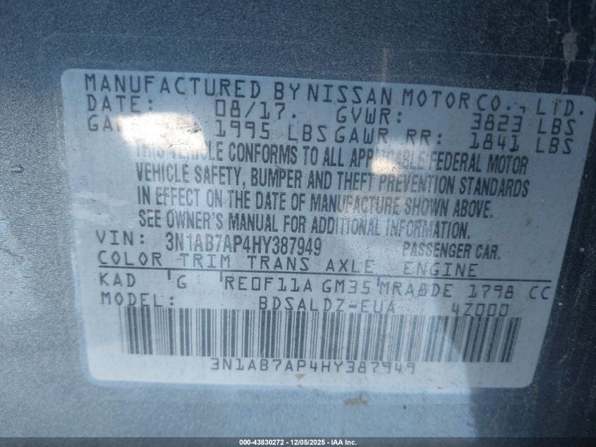 2017 NISSAN SENTRA 2017 року Бензин, 1.8, Передний привод, vin - 3N1AB7AP4HY387949 из США