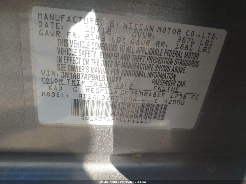 2019 NISSAN SENTRA 2019 року Бензин, 1.8, Передний привод, vin - 3N1AB7AP9KL611611 из США
