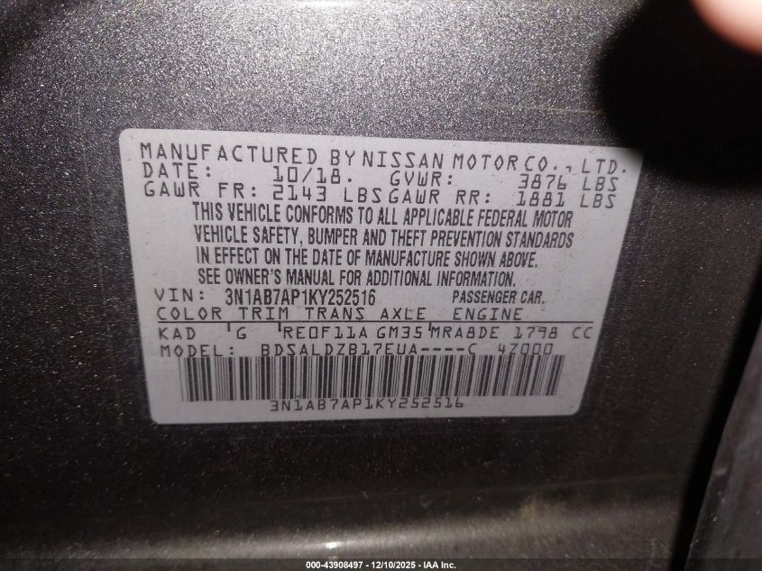 2019 NISSAN SENTRA 2019 року Бензин, 1.8, Передний привод, vin - 3N1AB7AP1KY252516 из США