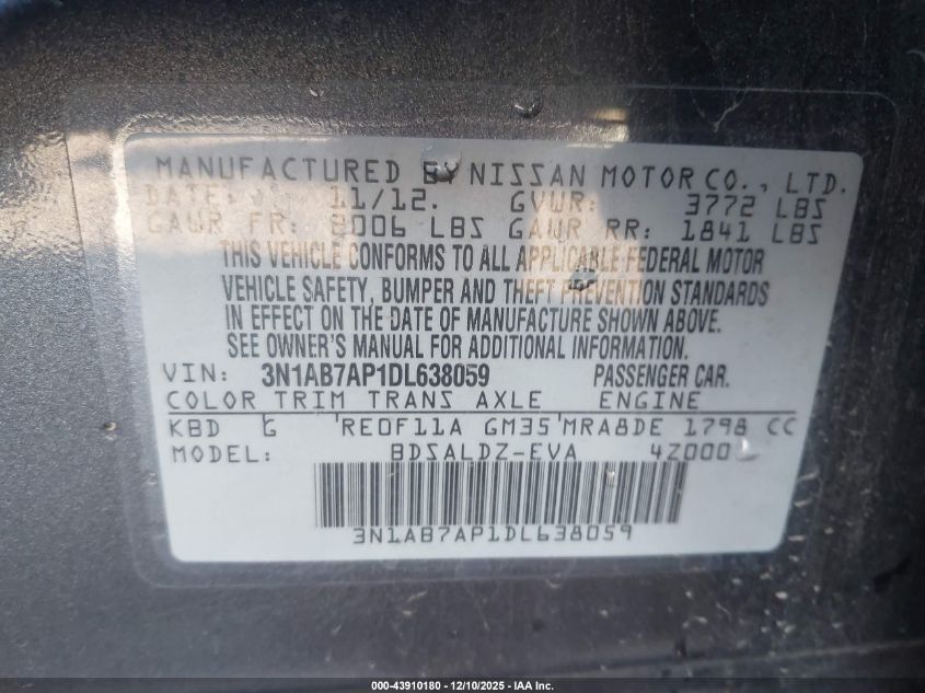 2013 NISSAN SENTRA 2013 року Бензин, 1.8, Передний привод, vin - 3N1AB7AP1DL638059 из США