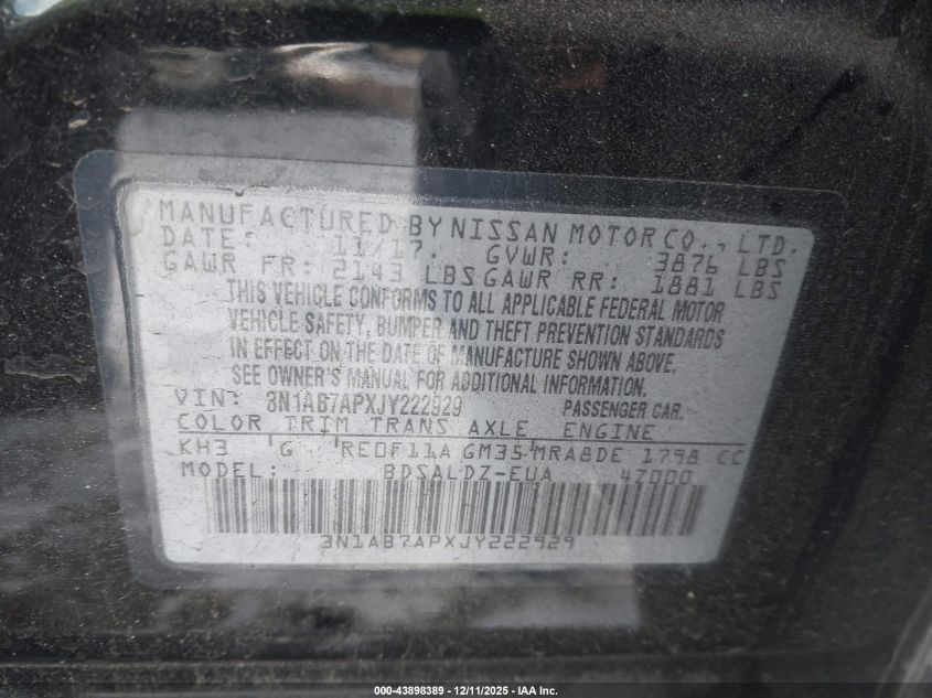2018 NISSAN SENTRA 2018 року Бензин, 1.8, Передний привод, vin - 3N1AB7APXJY222929 из США